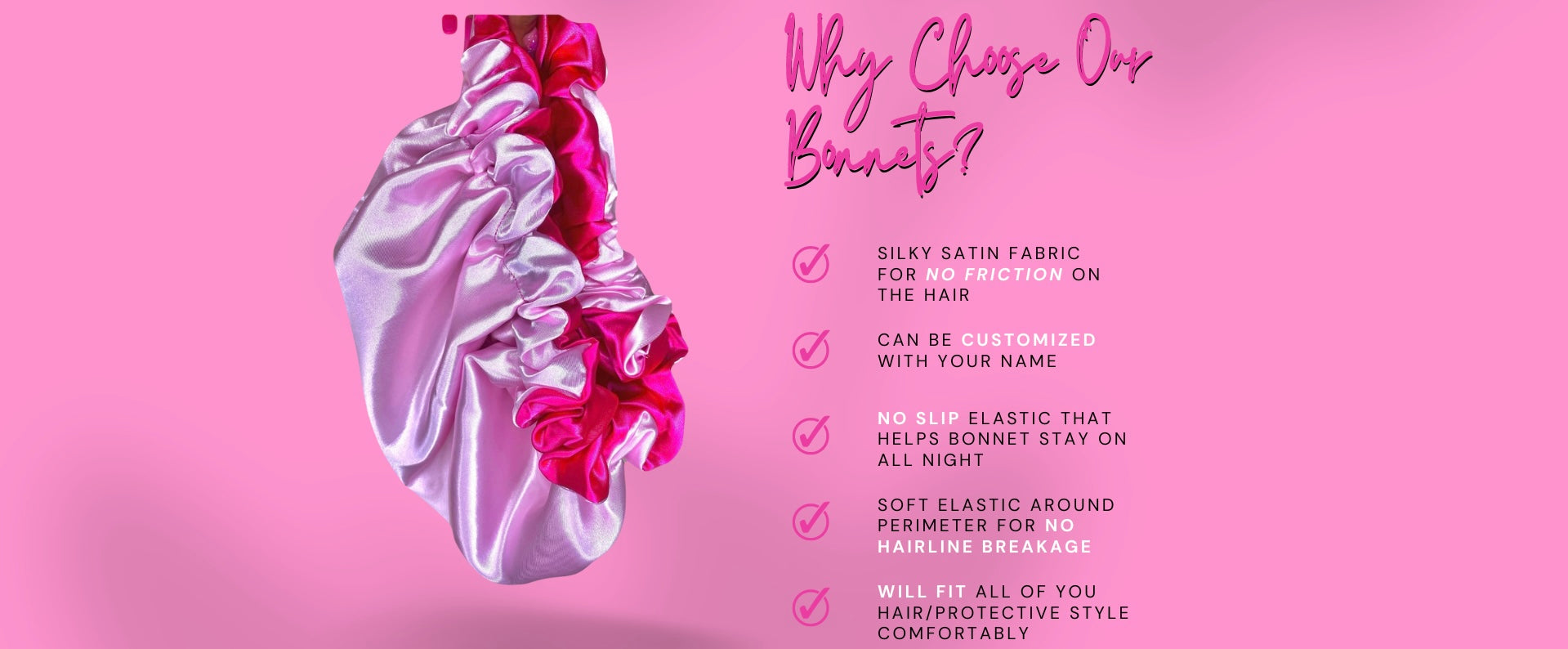 Our Bonnets are handmade from a smooth shiny charmeuse satin fabric. This allows for a notably soft bonnet that places no friction on the hair, resulting in maintaining the health of your hair!